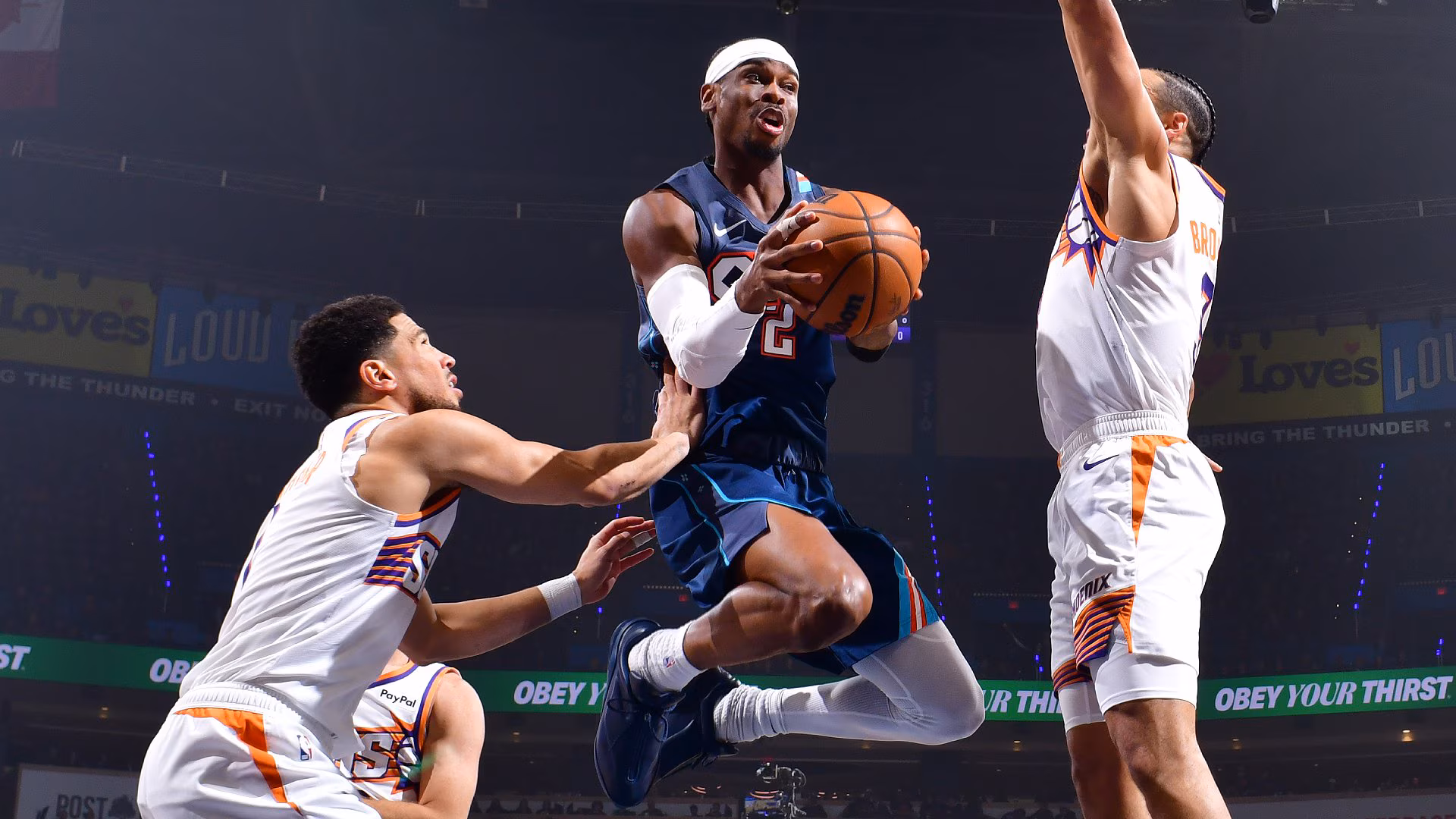 Penurunan tingkat penggunaan jelas lebih disebabkan oleh Thunder daripada keinginan Booker untuk mengambil gambar. Lihat saja penguasaan bola ini di awal Game 2, di mana Lu Dort tetap memeluk Booker, bahkan ketika bola berada di sisi berlawanan dari lantai dan ketika Dort mungkin tergoda untuk membantu menguasai bola…